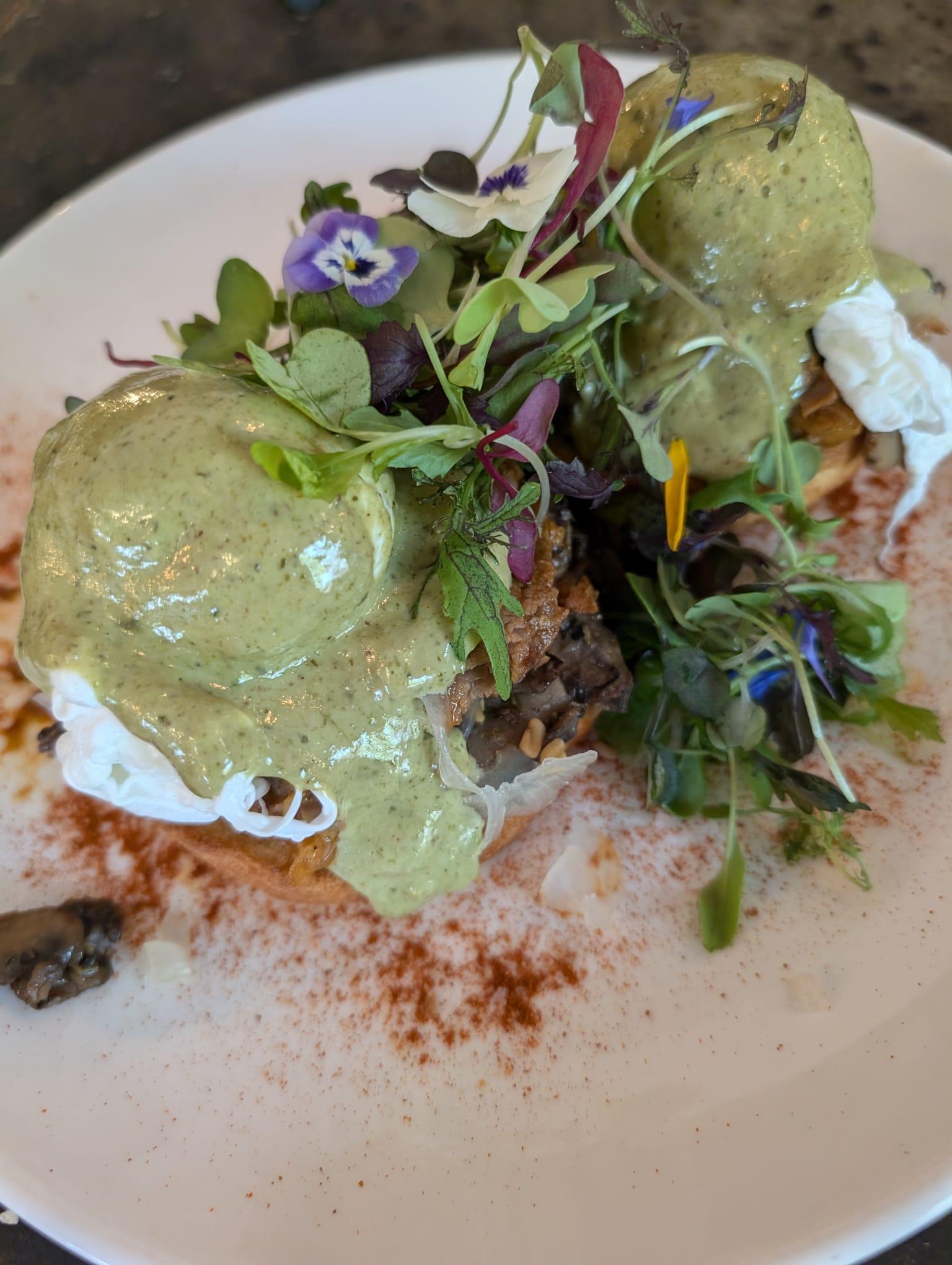 Deux muffins anglais garnis de champignons sautés et d’une touche de pâte de truffe, surmontés de deux œufs pochés et servis avec notre sauce secrète maison. Contient des noix, des produits laitiers et des fruits de mer.