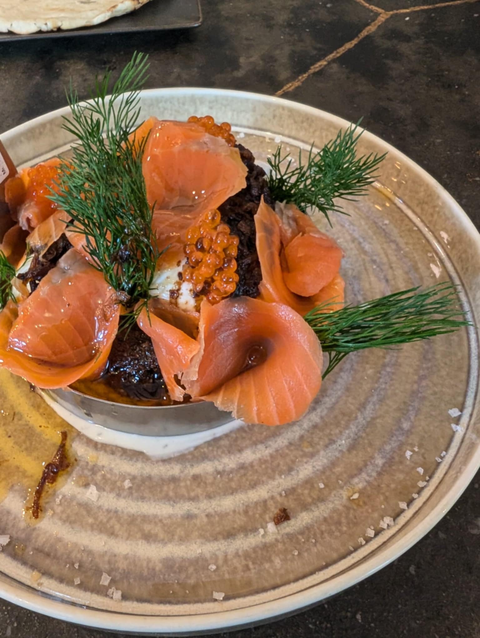 Deux pains buns avec œufs pochés, saumon fumé, guacamole, salicorne et oignons marinés. Servis avec...