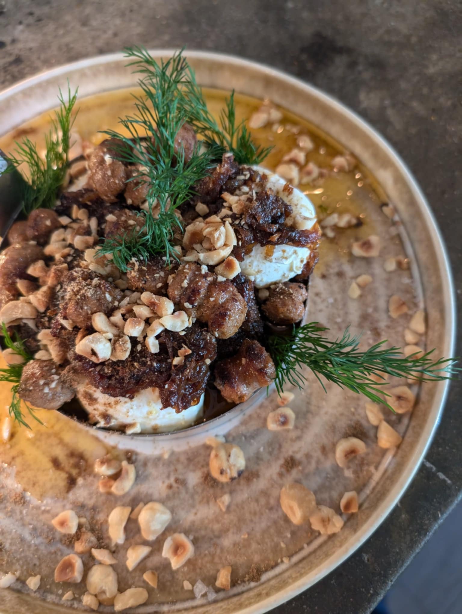 3 œufs pochés sur un lit de yaourt à la menthe, servis avec un beurre...