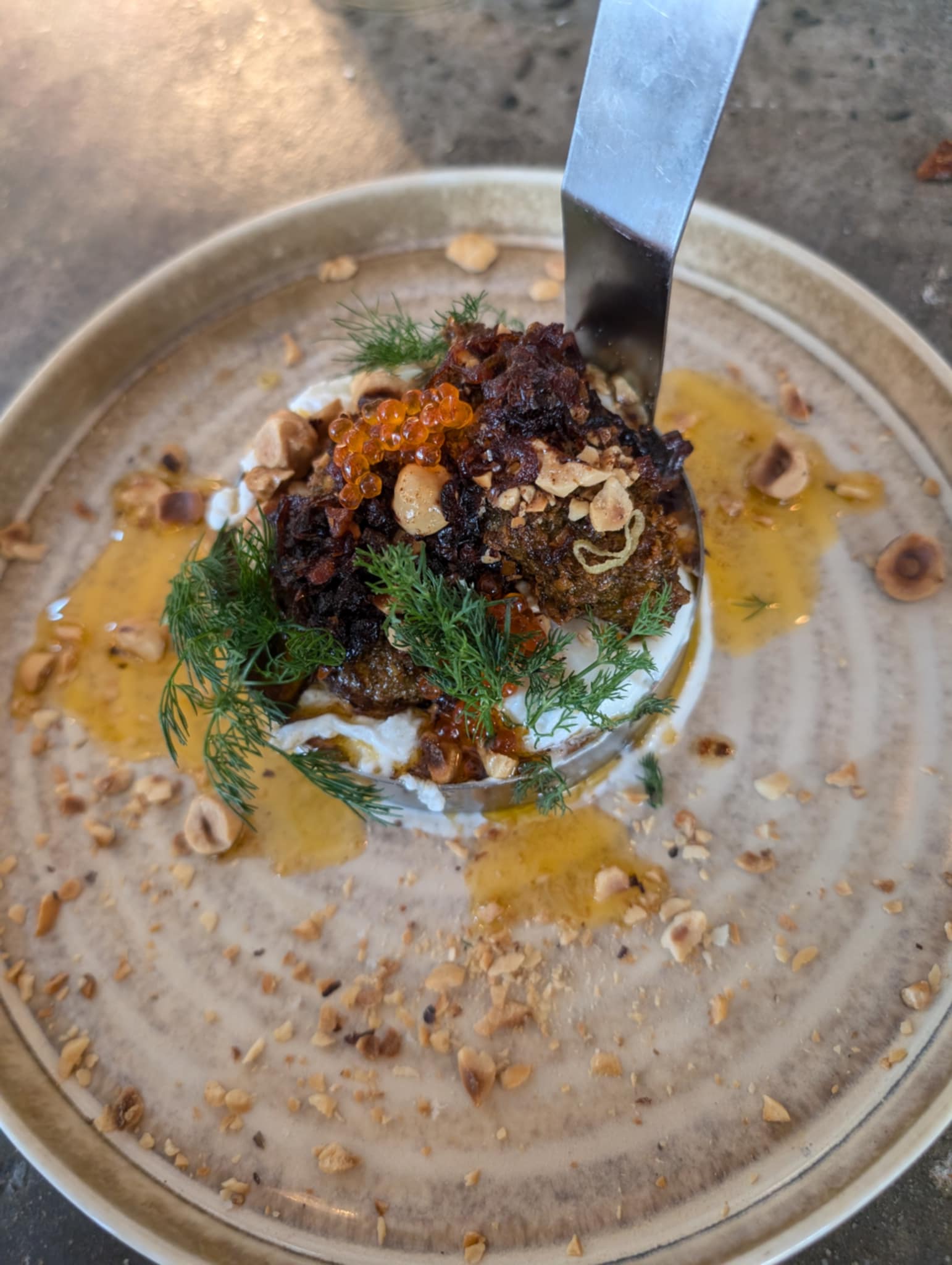pain bun, bœuf légèrement fumé avec oeuf miroir, Champignons à la pâte de truffe, oignons...