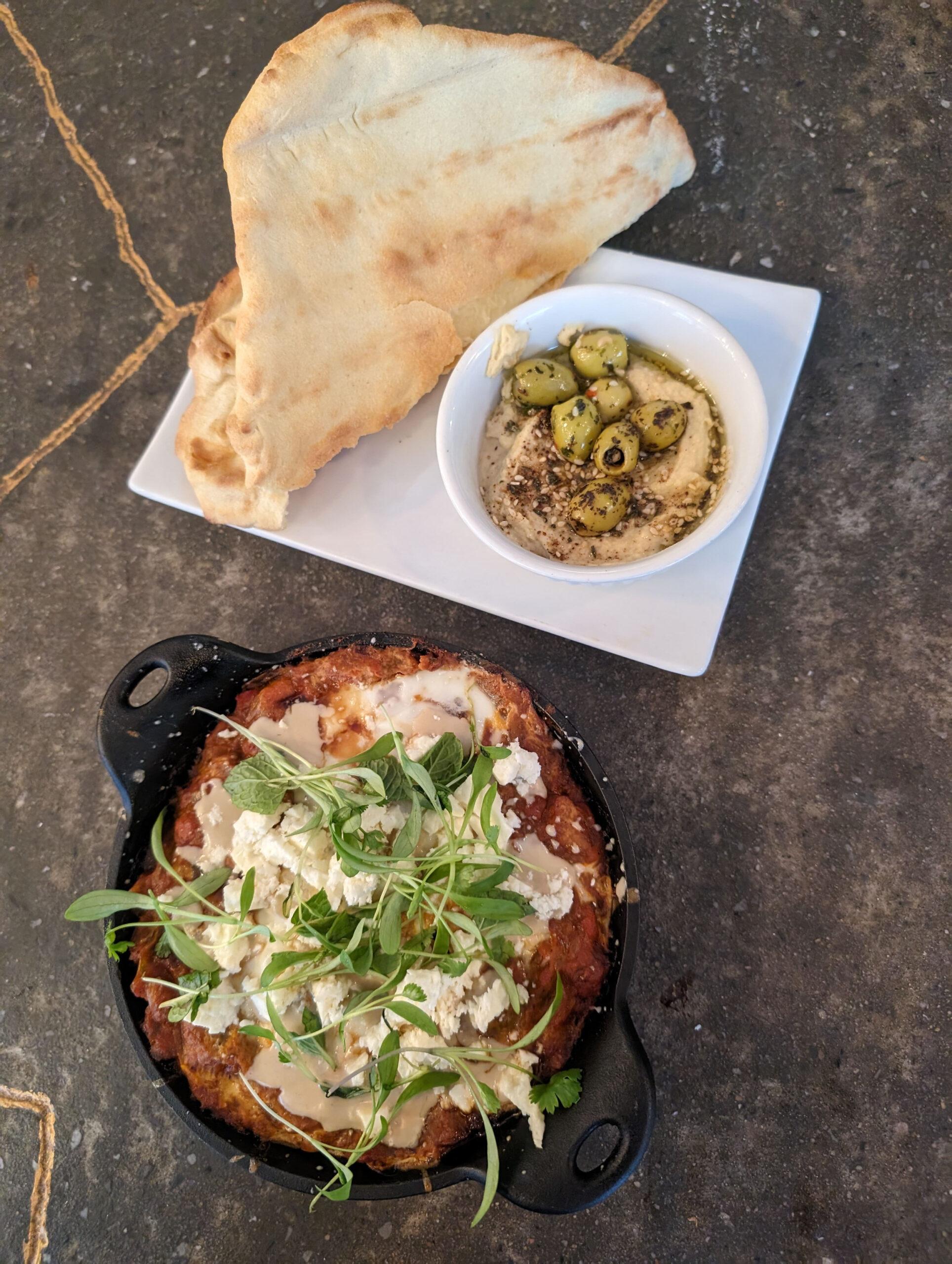 Œufs cuits dans une purée de tomates, poivrons rouges et oignons. Fromage feta, pain pita,...