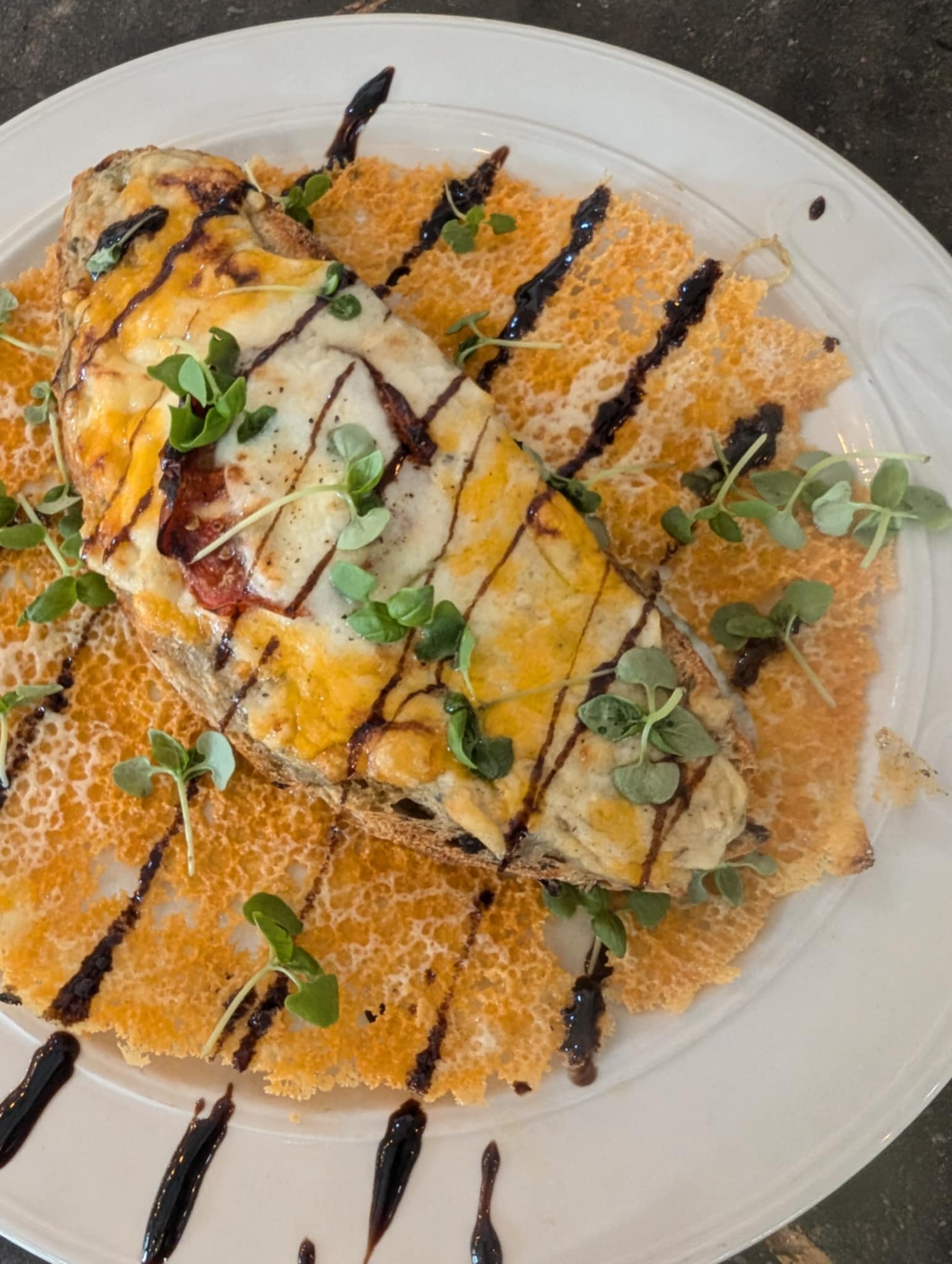 Tomate grillée, pesto maison, Fior di latte pasteurisé, sur pain aux olives. pignons. plat végétarien...