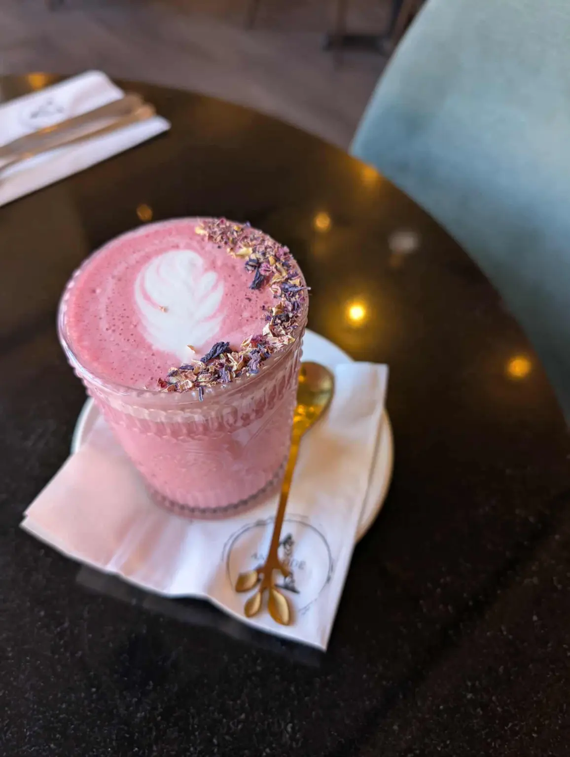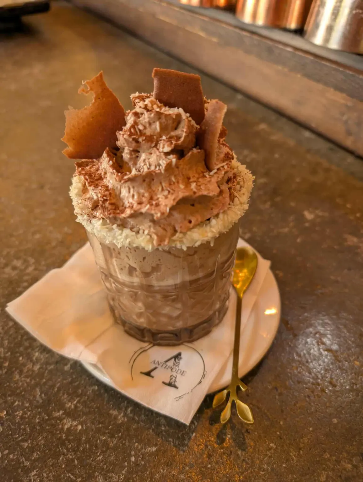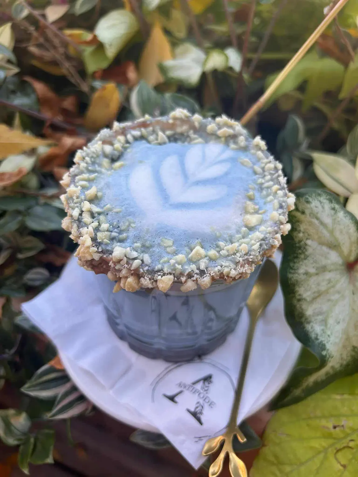 Lait, café, sirop de pistache, crème de pistache et pistache concassées le classique et populaire café d'Antipode