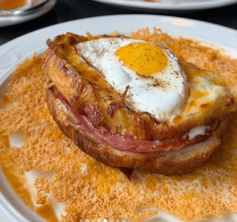 Jambon, béchamel, fromage, œuf miroir, bacon Contien du gluten, du porc, de la noix...